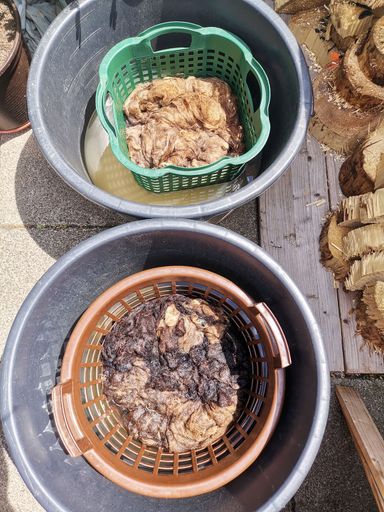 Die Rohwolle wird erst grob von Dreck und Stroh entfernt. Anschließend wird sie mit eigenem Kastanienwaschmittel 1-3 mal gewaschen.
